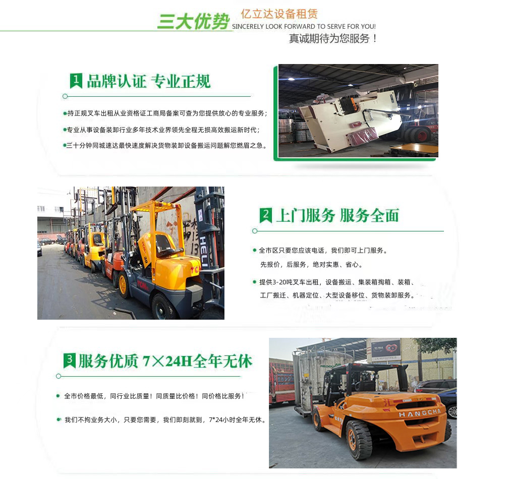 亿立达设备租赁有限公司是工商局准许的清华大学专业叉车出租公司,公司本着诚信、服务、效率、创新的经营理念,用精湛的技术,真诚的服务,为众多客户提供优质的服务,同时获得信赖与支持。专业提供清华大学3-20吨叉车出租、叉车租赁、设备搬运、集装箱掏箱装箱、机器移位定位、货物装卸、工厂搬迁、安全可靠,收费透明,价格便宜,随叫随到,24小时上门服务!本公司叉车吊车师傅对各种设备搬运装卸都有深刻探讨和研究。很多的疑难设备搬运,通过我公司的叉车师傅都能迎刃而解。对各种进口设备、国产机器、大型设备搬迁、高难度搬迁、各种精密仪器、医疗设备、科研设备等都能搬运; 提供全市 24 小时上门装卸搬运服务。同时提供厂房搬迁服务。 ...